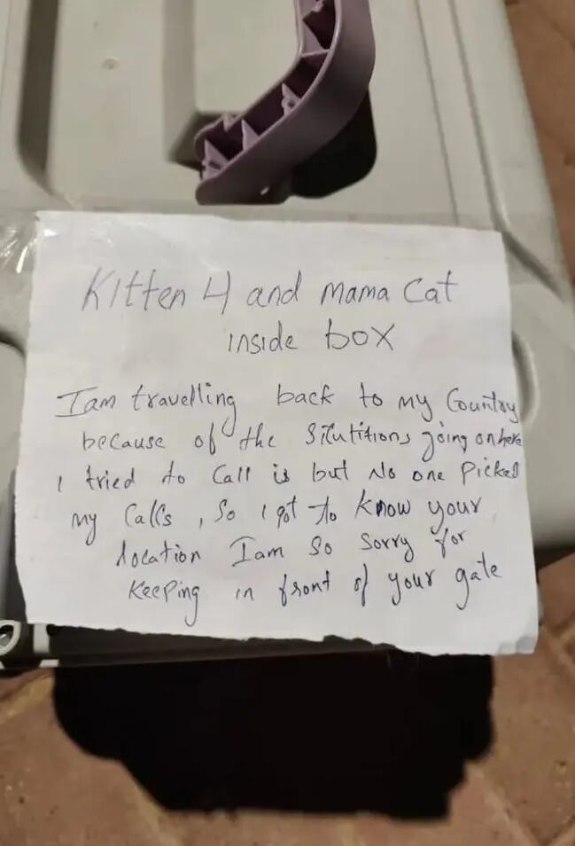 在阿尔艾因,一位居民发现家门口突然多出来一个笼子,里面是一只母猫和四只小猫,笼子上贴着一张手写纸条,上面说自己回国了,带不走猫了,只能把它们丢在别人家门口。