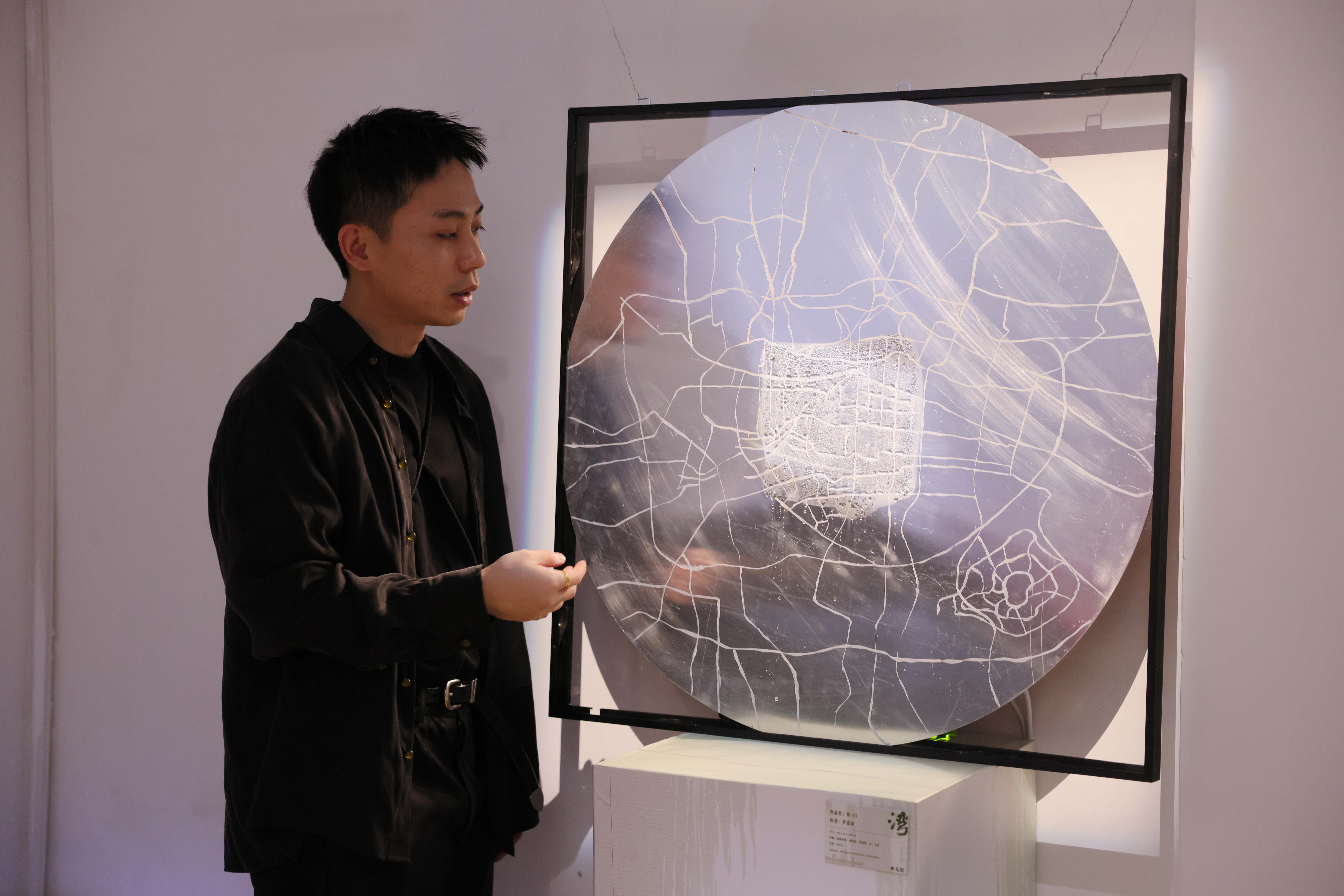 来自中国香港的策展人、艺术家罗嘉豪,毕业于中央美术学院,有着丰富的策展与参展经验。本次,他将传统元素有机融合进行艺术创作:“我根据陈家祠的状元标杆做出转换,从立柱改为挂式平面,中间以广府风车融合中国结做成可转动的装置,寓意丰收的意像,也是整套作品表达刻苦耐劳与收成的广东精神。4张温感变化装置,外形是传统古昼桌,桌面是温感变化的问绘昼,观众可用桌上的水和笔在正画面随意挥动,与画面的温感产生互动效果。”