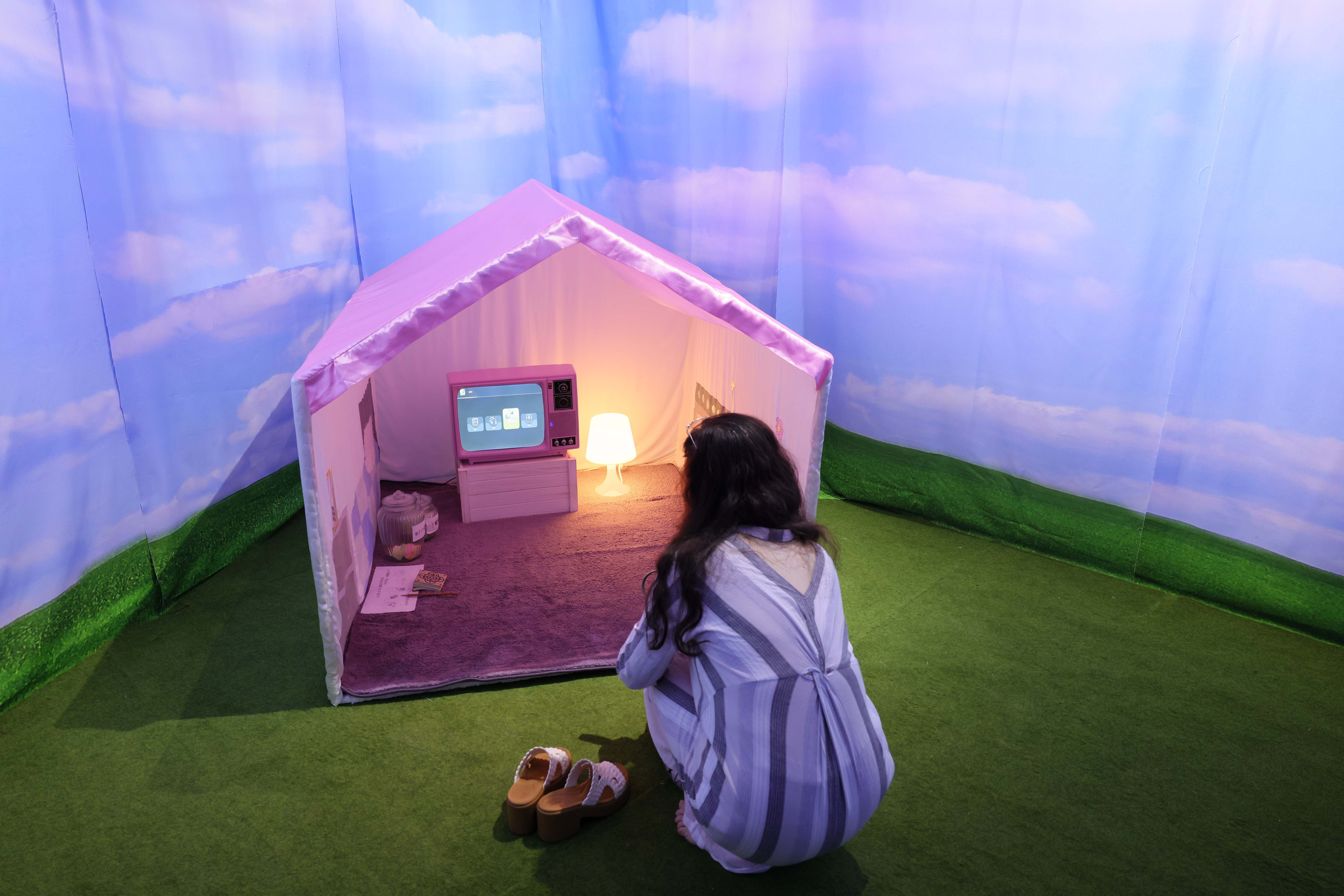 特邀艺术家陈十三对荔湾城市景观中人际关系的黏性及岭南文化包容性展开观察,将荔湾中秋花灯与迎春花市的暖色灯笼光影、雨夜元素与传统建筑的山墙、屋脊及现代建筑体块相融合,融入个人对记忆与乡愁的思考。作品中“珍珠”的意象尤为突出,喻指人脑记忆如蚌壳育珠般在反复回溯中重塑,如同老照片在设备迭代中形成的“数码包浆”,而个体记忆的汇聚亦构成了城市的集体记忆。